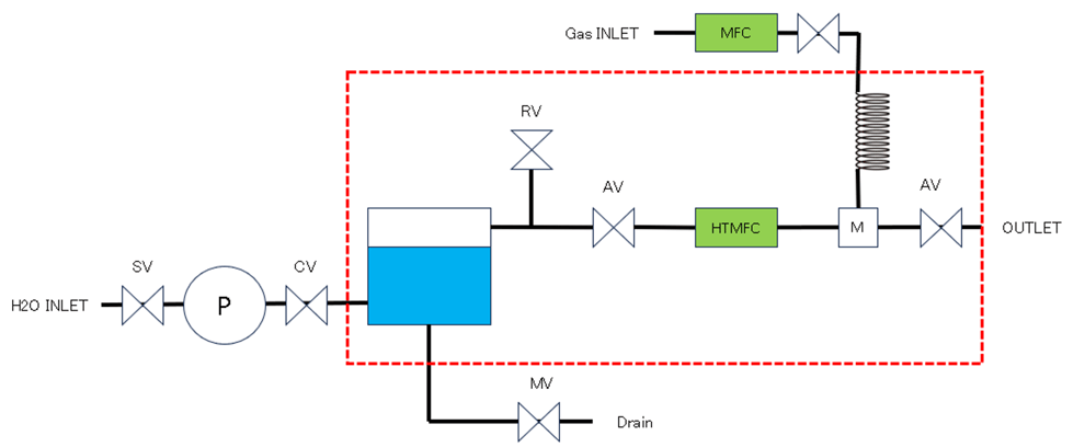 H2O容器を加熱し、ガス化したH2Oを高温用マスフローコントローラにより、任意の流量に制御し供給するシステムです。